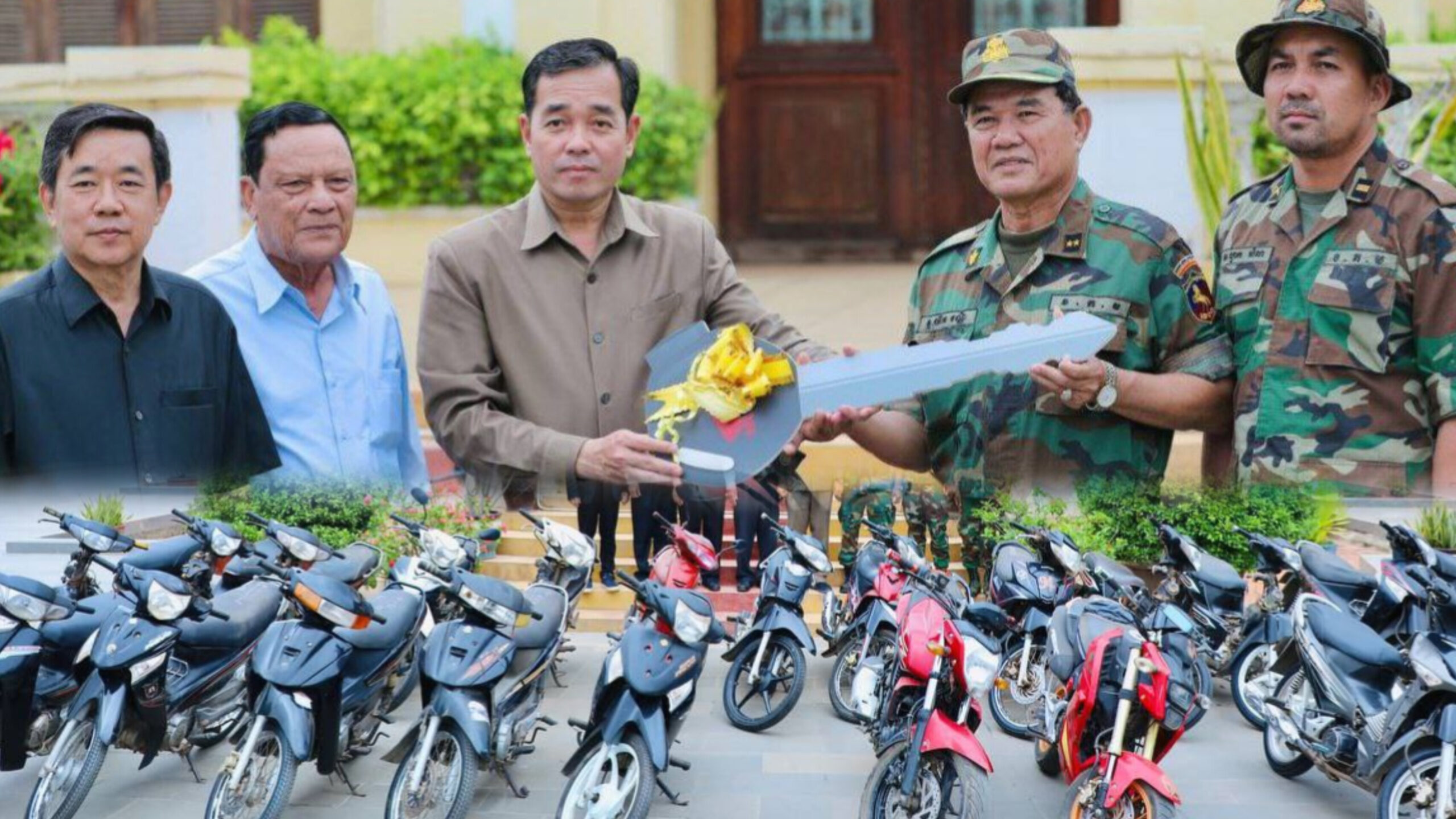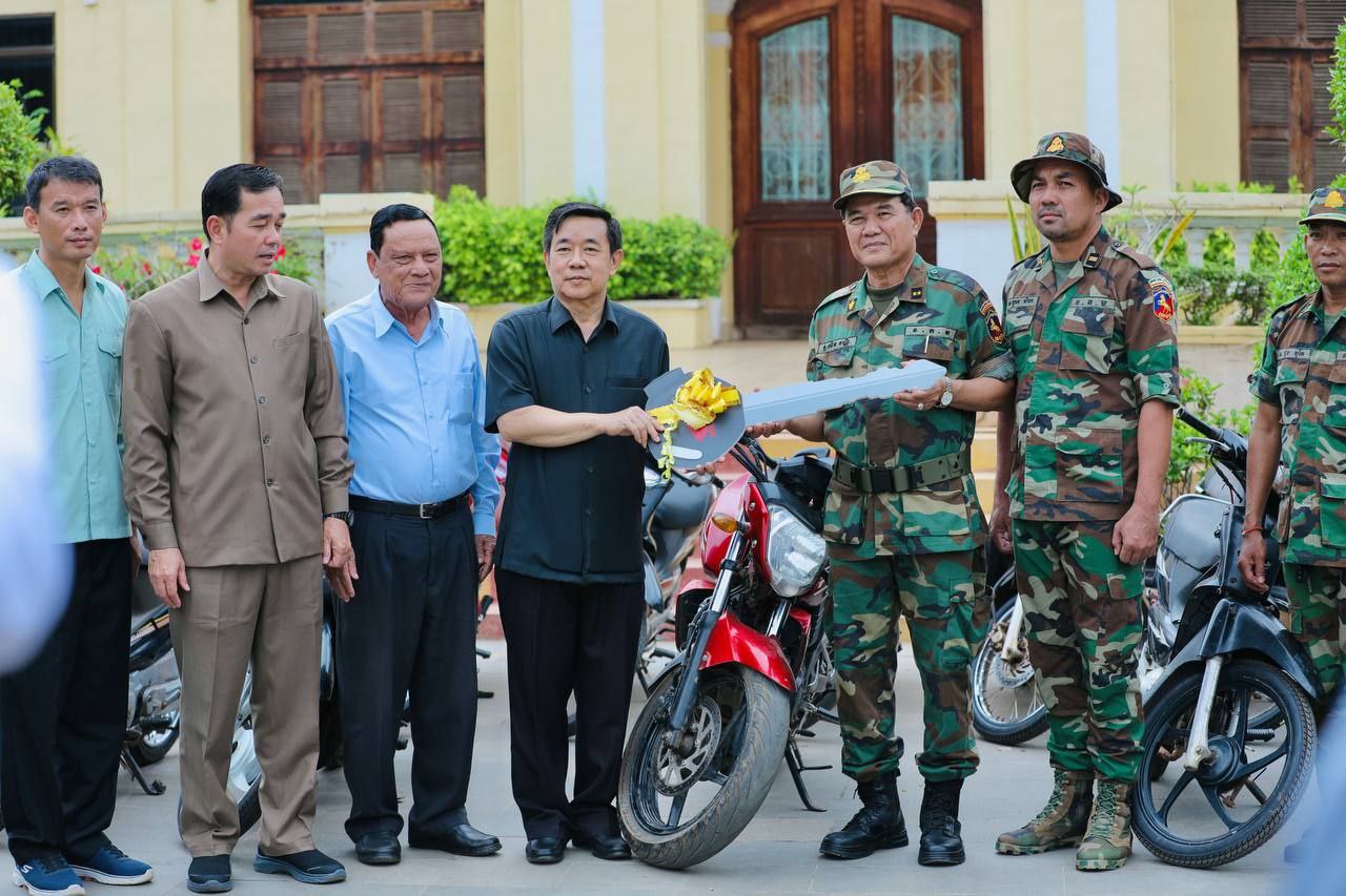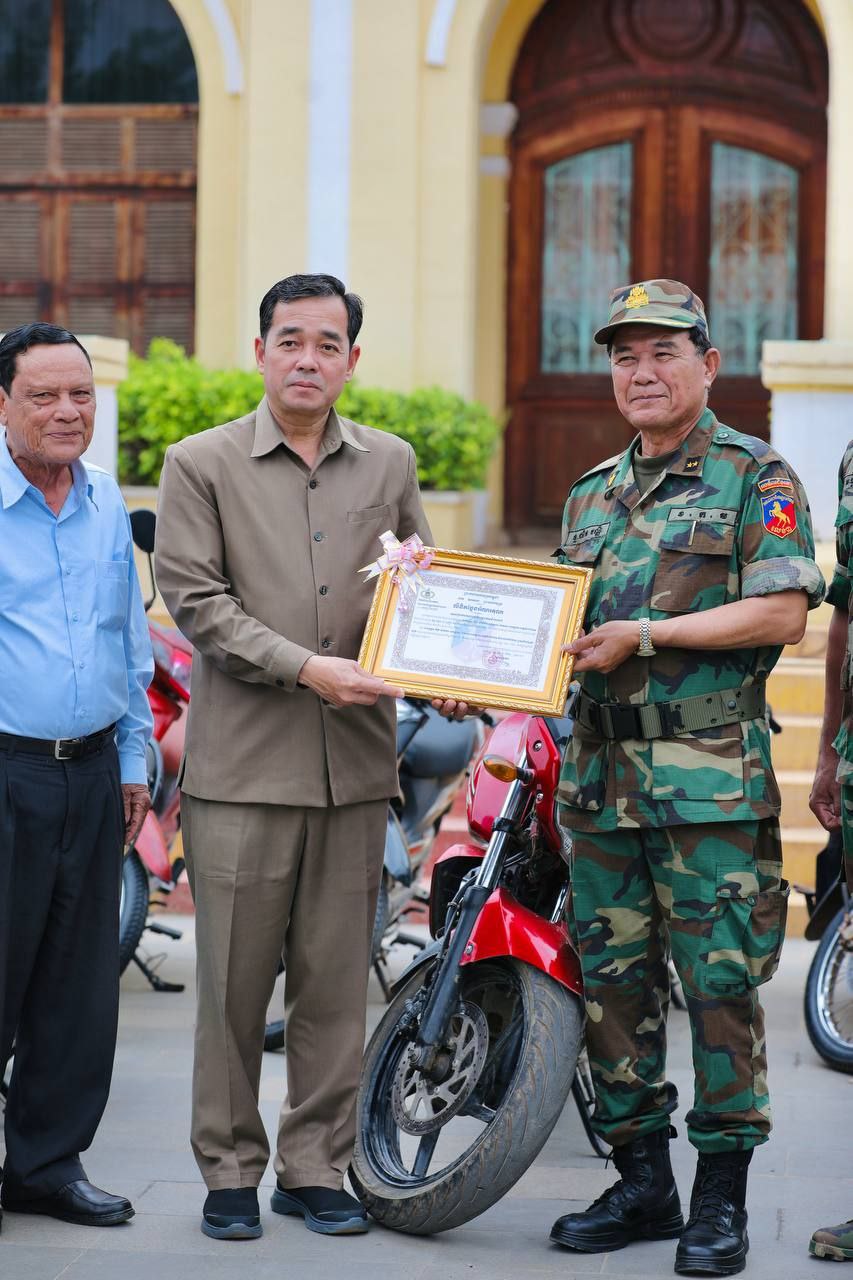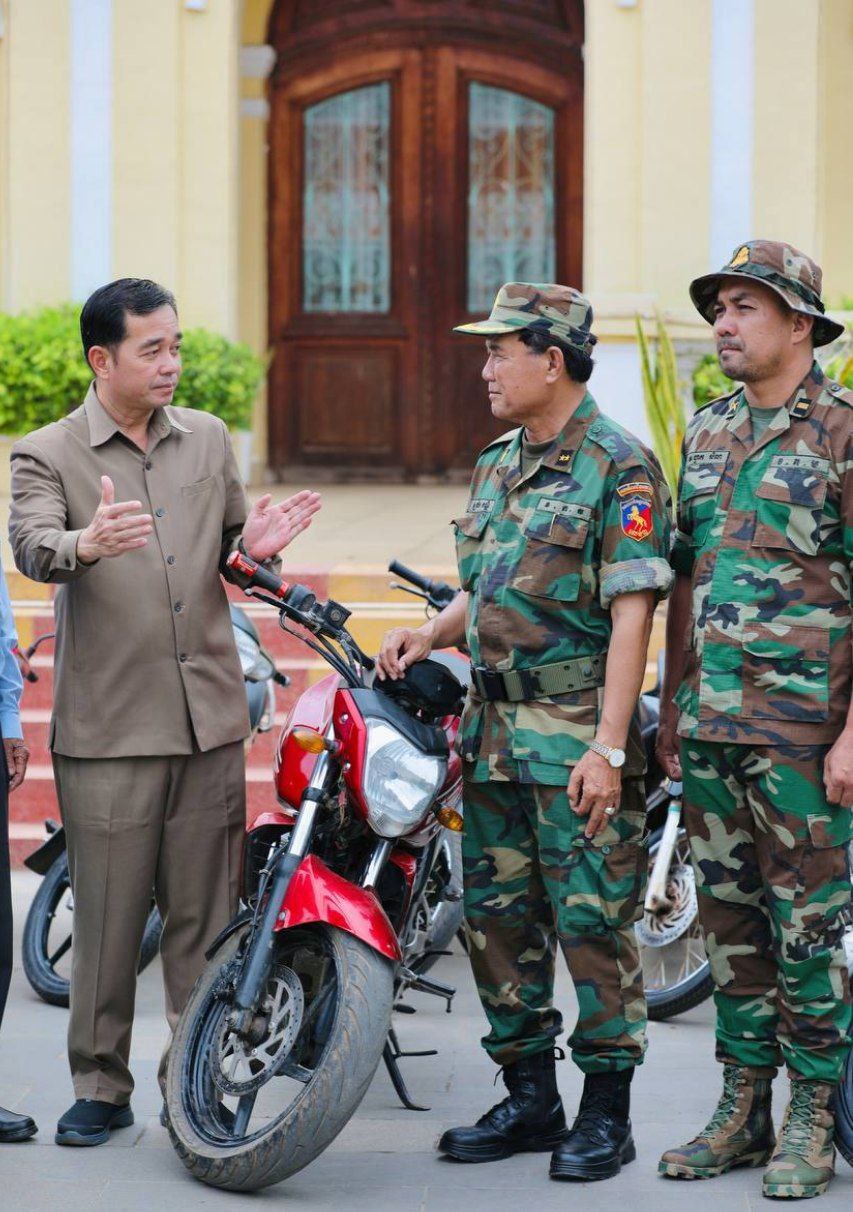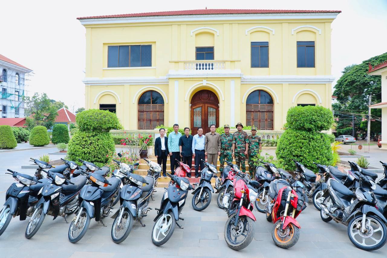(កំពង់ចាម): ស្របពេលដែលសមរភូមិជួរមុខកំពុងតែឈរជើងទុបទល់និងការឈ្លានពានពីសំណាក់កងទ័ពសៀម នៅចំណុចព្រំដែនខេត្តព្រះវិហារ និងឧត្តរមានជ័យ បានជួបកង្វះខាតសម្ភារៈប្រើប្រាស់មួយចំនួន។ ដោយឃើញបែបនេះ រដ្ឋបាលខេត្តកំពង់ចាម ពិសេសក្រោមការសម្របសម្រួលពីឯកឧត្តមកើត រិទ្ធ ឧបនាយករដ្ឋមន្ត្រីរដ្ឋមន្ត្រីក្រសួងយុត្តិធម៌ បានផ្ដល់ជូនម៉ូតូច្រើនប្រភេទរហូតដល់ចំនួន ១០០គ្រឿង សម្រាប់កងកម្លាំងជួរមុខយកទៅបំពេញការងារបម្រើក្នុងអង្គភាពងាយស្រួលឈរជើងការពារតាមបន្ទាត់ព្រំដែន។