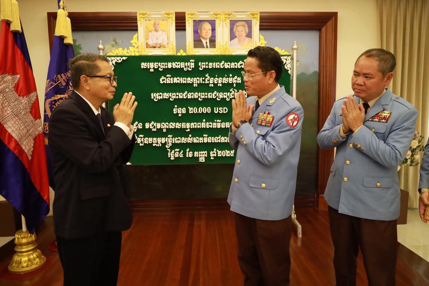 សម្តេចមហាមន្ត្រី ព្រះរាជតំណាង មានប្រសាសន៍ជម្រាបជូនថា សម្តេចព្រះមហាក្សត្រី ព្រះវររាជមាតាជាតិខ្មែរ ជាទីគោរពសក្ការៈដ៏ខ្ពង់ខ្ពស់បំផុត ព្រះអង្គមានព្រះរាជហឬទ័យមេត្តាករុណាសណ្តោសប្រោសប្រណីដ៏ខ្ពង់ខ្ពស់ជានិច្ច ចំពោះសុខទុក្ខ និងការលំបាកខ្វះខាត ក្នុងជីវភាពរស់នៅរបស់កូនចៅ ចៅទួតរបស់ព្រះអង្គ ព្រមទាំងពរជ័យសិរីមង្គលដ៏បវរមហាប្រសើរ ពីអង្គសម្តេចព្រះមហាក្សត្រី ព្រះវររាជមាតាជាតិខ្មែរ ជាទីគោរពសក្ការៈដ៏ខ្ពង់ខ្ពស់បំផុត ជូនមន្ត្រីបោសសម្អាតមីននៅតាមតំបន់ព្រំដែនរបស់កម្ពុជា សូមទទួលបានជោគជ័យក្នុងបេសកកម្មដ៏ឧត្តុងឧត្តម ជូនជាតិមាតុភូមិ។
