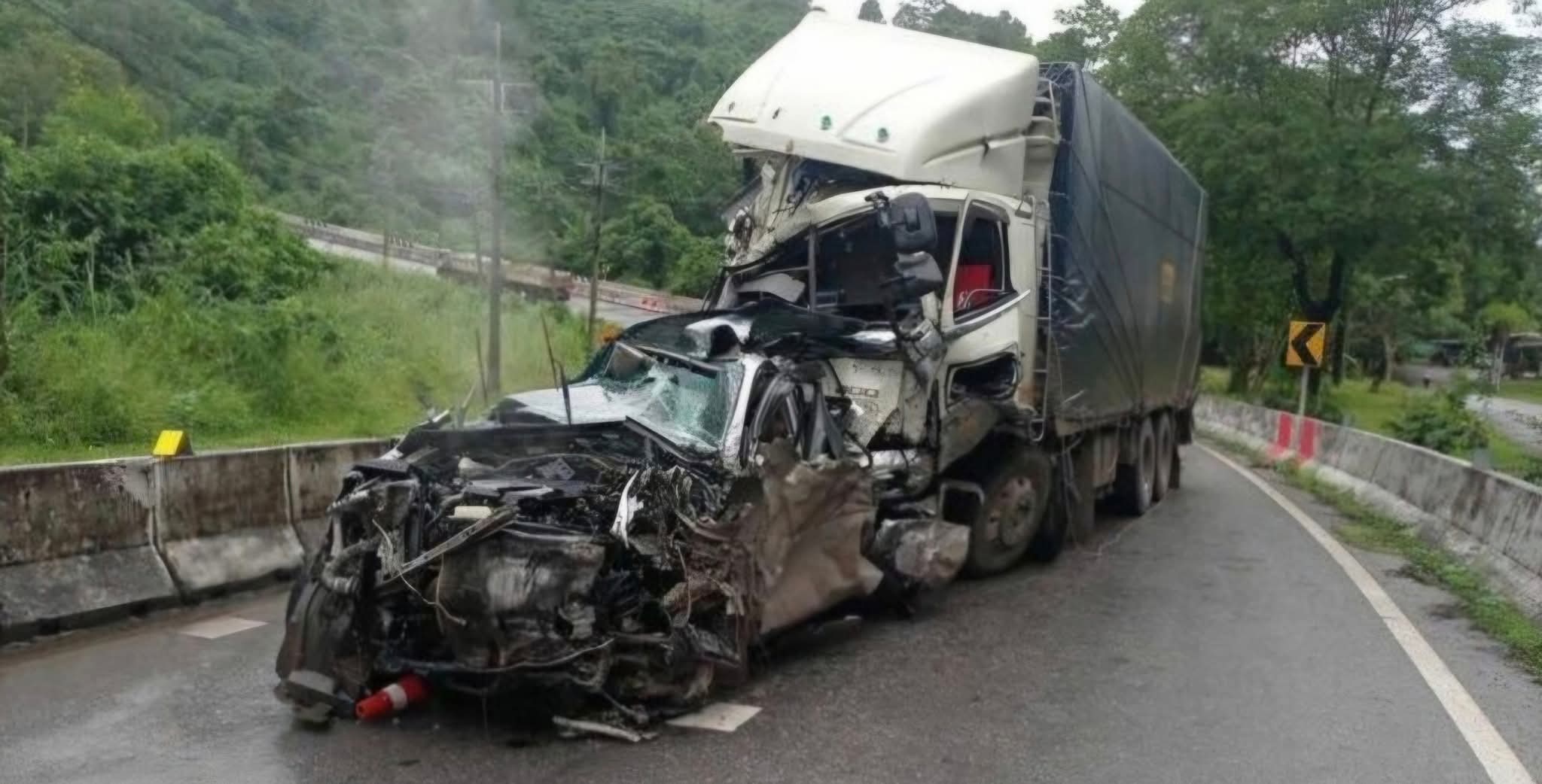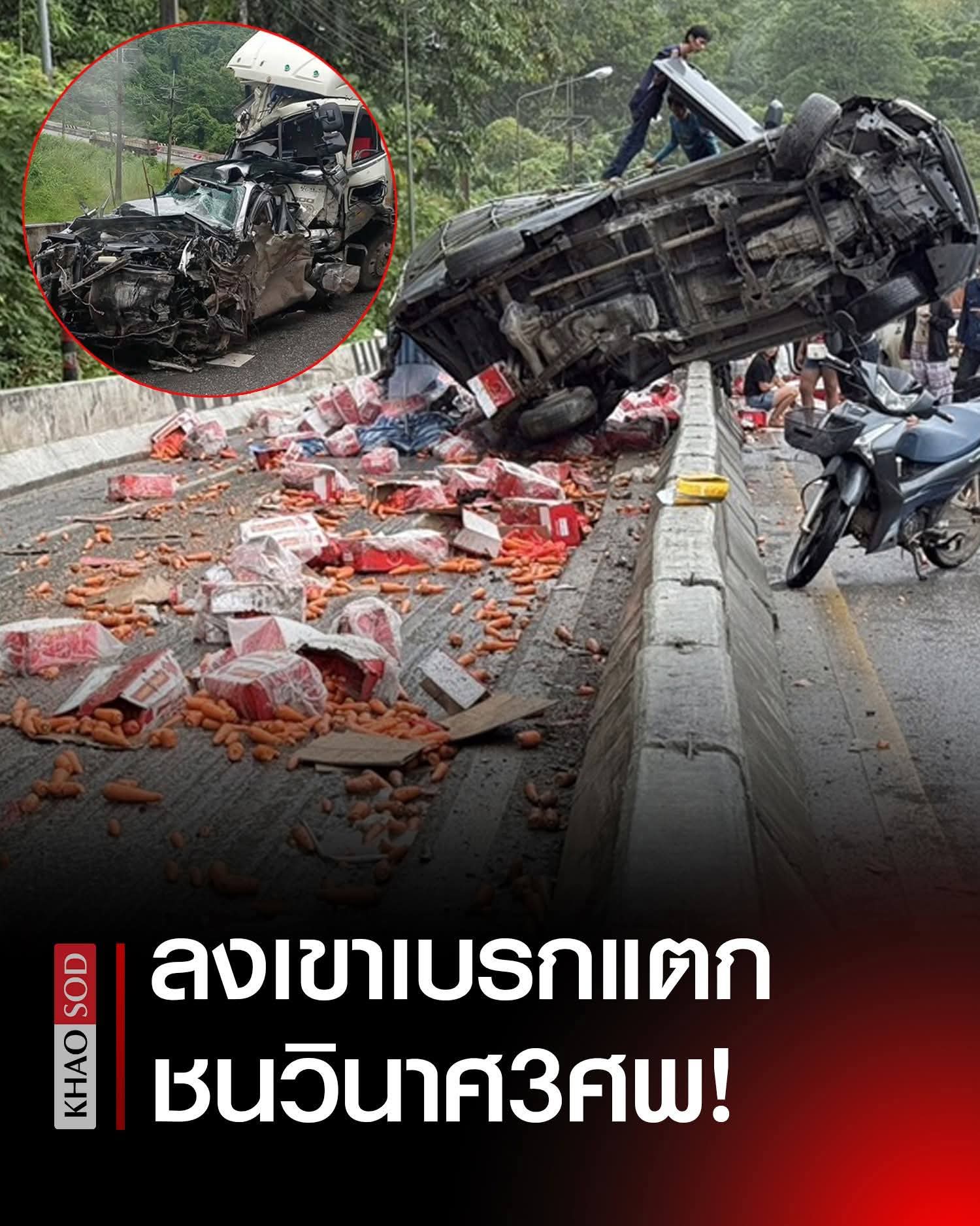 រថយន្តដឹកទំនិញកង់១០បានដាច់ហ្វ្រាំងចុះចំណោតបុករថយន្តPicup៤គ្រឿង ពេញទំហឹង ស្លាប់៣នាក់ និងរបួសជាង១០នាក់ Sangkhlaburi ខេត្ត Kanchanaburi នៅពីថ្ងៃទី២៣ខែកក្កដា នេះ។