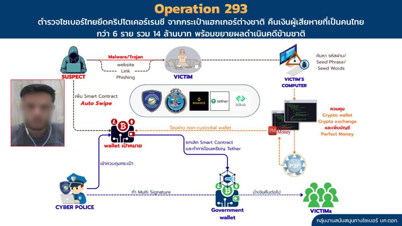 ឧត្តមសេនីយ៍ឯក ស៊ូរ៉ាផុន ព្រេមភូត ដែល​ដឹកនាំ​ការិយាល័យ​ស៊ើបអង្កេត​ឧក្រិដ្ឋកម្ម​អ៊ីនធឺណិត (CCIB) របស់​ប្រទេស​ថៃ បាន​បង្ហាញ​ថា “ប្រតិបត្តិការ ២៩៣” បាន​បណ្តាល​ឲ្យ​មាន​ការ​រឹបអូស និង​ប្រគល់​រូបិយប័ណ្ណ​ឌីជីថល​ដែល​មាន​តម្លៃ ៣២០,០០០ ដុល្លារ​ទៅ​ឲ្យ​ជនរងគ្រោះ​ថៃ នេះ​បើ​តាម​របាយការណ៍​ប្រព័ន្ធ​ផ្សព្វផ្សាយ​ក្នុងស្រុក។
