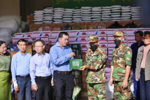 កំពង់ចាម: អភិបាលនៃគណៈអភិបាលខេត្តកំពង់ចាម លោក អ៊ុន ចាន់ដា បានអញ្ជើញប្រគល់ អំណោយជំហានទី២ ជាថវិកា គ្រឿងឧបភោគ បរិភោគ និងសម្ភារៈប្រើប្រាស់ចាំបាច់នានា ជូន ដល់វីរកងទ័ព នៃកងពលតូចអន្តរាគមន៍លេខ៦ ដែលកំពុងការពារដែនអធិបតេយ្យភាព បូរណភាពទឹកដី ពីចោរឈ្លានពានសៀម នៅតាមខ្សែ